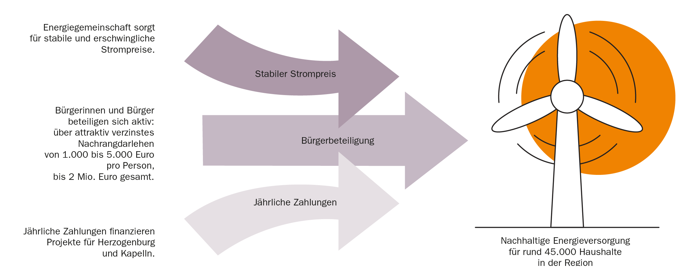 Alle Privathaushalte im Unteren Traisental als auch Klein- und Mittelunternehmen können durch stabile Stromtarife profitieren. Über eine Bürger-Energie-Gemeinschaft (BEG) besteht die Möglichkeit, für 20 Jahre einen fixierten und stabilen Stromtarif beziehen zu können, wenn eine ausgewählte BEG-Windkraftanlage der ImWind Strom produziert. Das schafft Planbarkeit und bringt echte finanzielle Vorteile für die Menschen vor Ort. Darüber hinaus kann die Bürger-Energie-Gemeinschaft in bestehende EEG-Strukturen eingebunden werden und so die gegebenenfalls schon vorhandene PV-Erzeugung perfekt ergänzen.